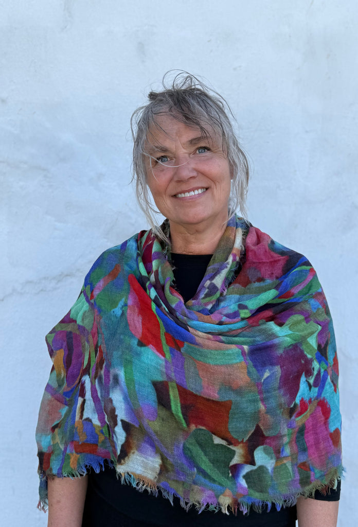 Dette flotte multifargede skjerfet er veldig livlig og passer de fleste. Du har utrolig mange farger du kan ta opp igjen på klærne når du bruker dette skjerfet. Nydelig kvalitet! 100% ull, 70x180 cm.