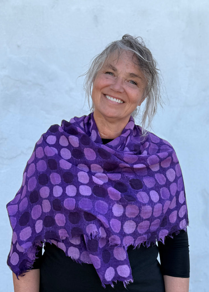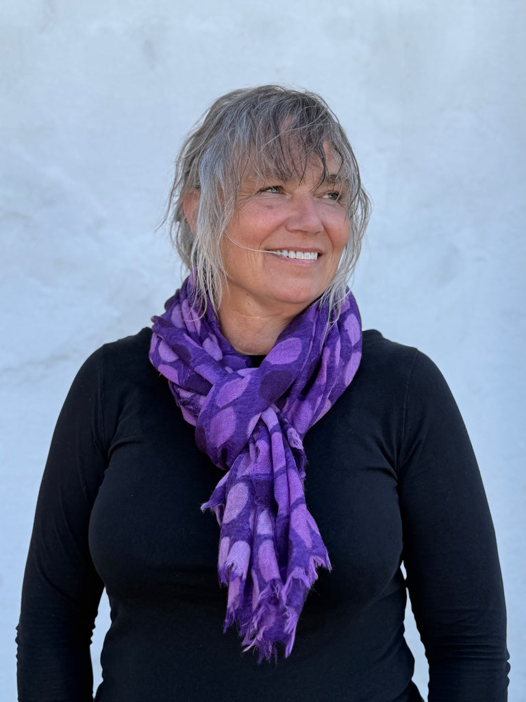Dette friske prikkete skjerfet i flotte lillafarger er fint til alle som er glad i lilla. Fantastisk kvalitet! 100% ull, 70x180 cm.