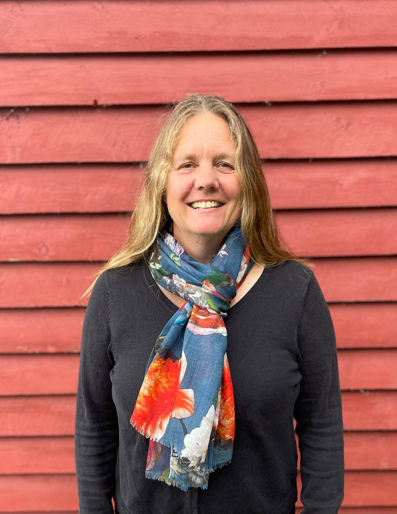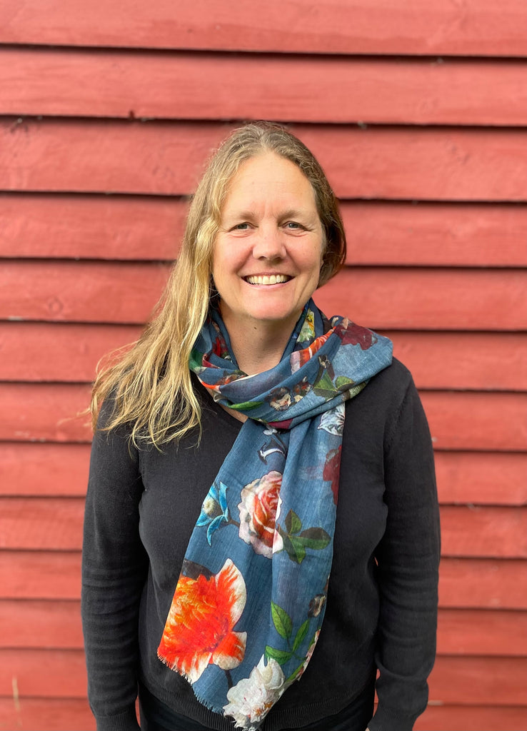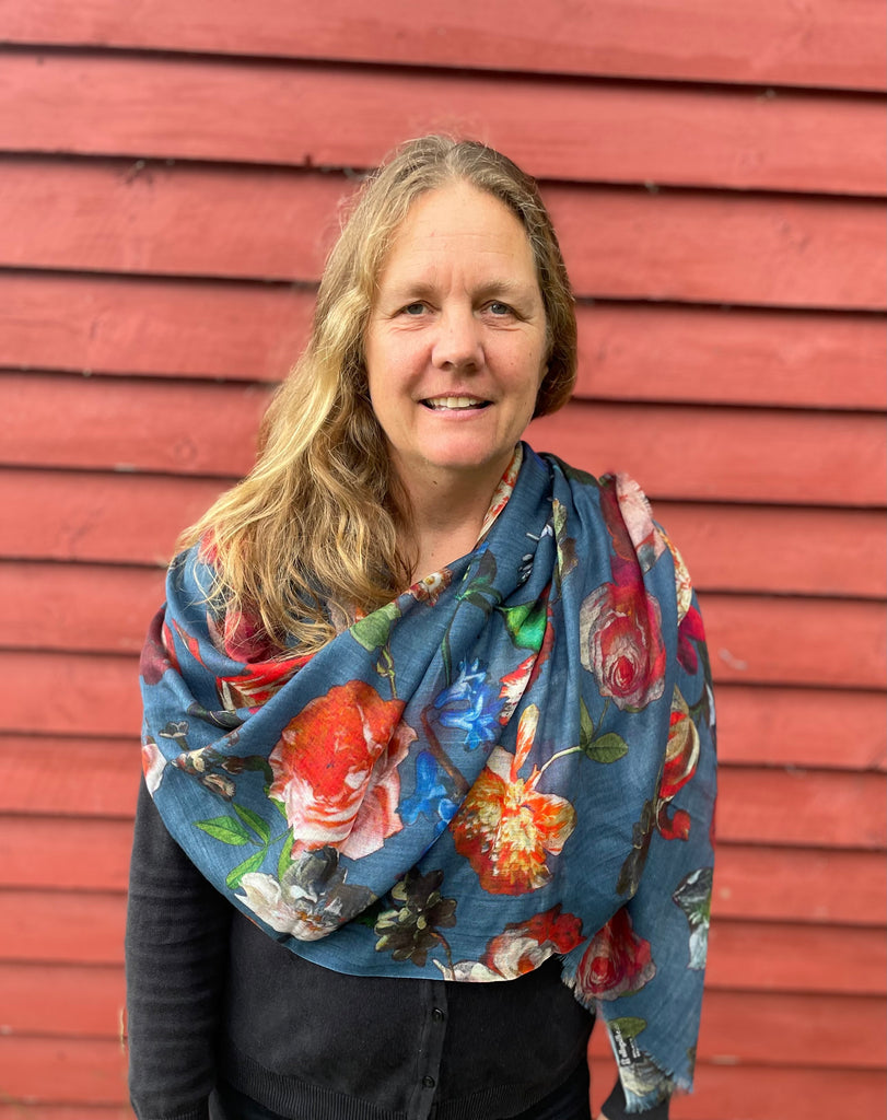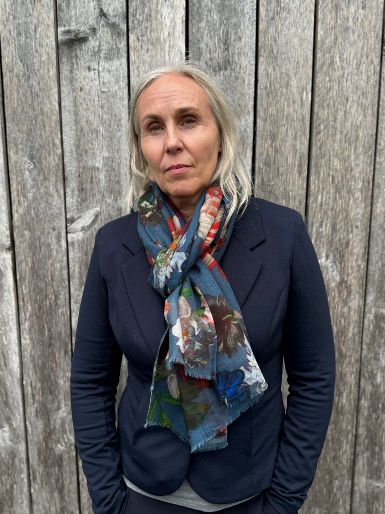 Dette flotte supertynne skjerfet er blått med masse blomster. Passer de fleste. Fantastisk kvalitet. 100% ull, 70x180 cm.