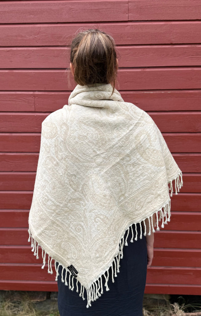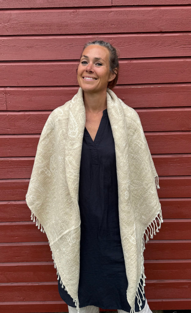 Dette flotte store kastet i tradisjonelt indisk mønster i offwhite farge, er like fint til bunaden som når du sitter ute på verandaen en sommerkveld. Det er jacquardvevd, dvs dobbelt vevd, og er derfor like fint på begge sider. Det er bare å se hvilket mønster som passer best til antrekket eller humøret. Fantastisk kvalitet! 100% ull, 140x140 cm.