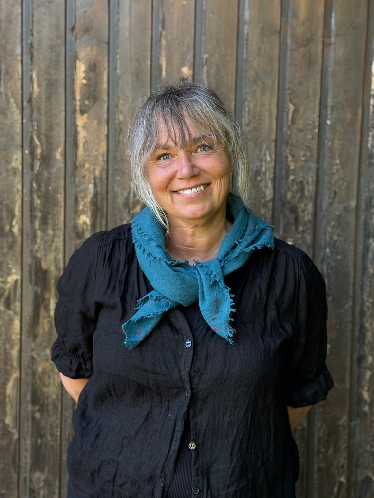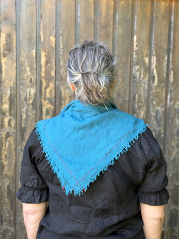 Dette lille flotte ullskjerfet i petrolblått med en liten artig detalj, en smal «tråklesøm» i rødt som gjør skjerfet, kan brukes som et lite kast eller trekantskjerf, eller det kan surres rundt halsen. Skjerfet er kvadratisk.