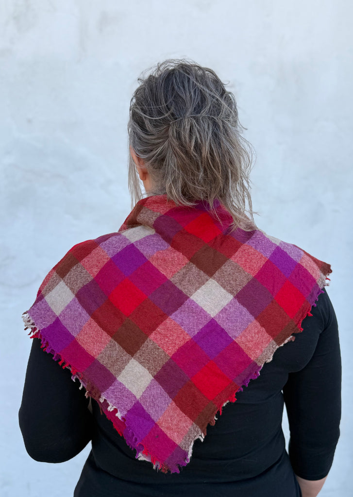 Dette lille flotte ullskjerfet i rutete rosa og rødfarger kan brukes som et lite kast eller trekantskjerf, eller det kan surres rundt halsen. Skjerfet er kvadratisk.Finfin kvalitet! 100%, 70x70 cm.
